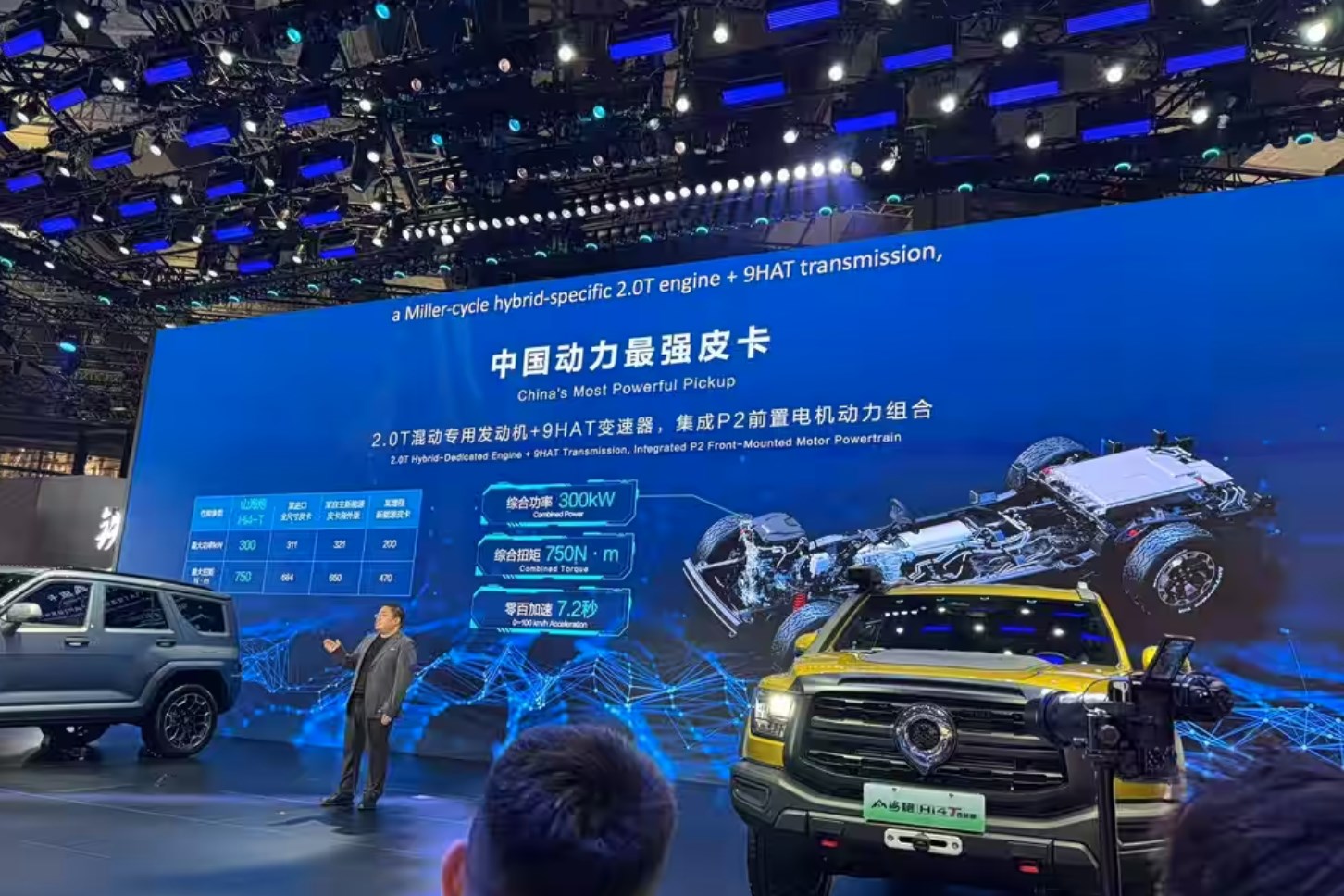 在發(fā)布會現(xiàn)場,官方稱長城山海炮Hi4-T為“中國動力最強皮卡”,搭載2.0T發(fā)動機+9HAT變速器+P2前置電機組成的插混動力,綜合功率300千瓦,綜合扭矩750牛·米,百公里加速7.2秒,而這輛車的到來,也標志著長城皮卡正式邁入新能源領域。