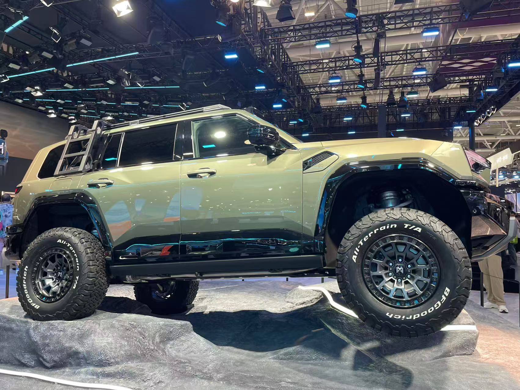 從造型上看,猛士M817延續(xù)硬派、越野風格設(shè)計,線條棱角分明,燈組部分的設(shè)計以及發(fā)光Logo的加入,也提升了車頭部分的科技感,車頂三個凸起分別是激光雷達與兩側(cè)的探照大燈。